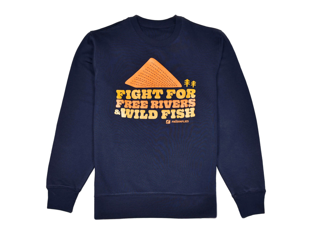 Navy blue premium sweatshirt with burnt orange and burnt yellow ‘Fight for Free Rivers & Wild Fish’ print. Every purchase contributes to creating funds for the organizations we support; NASF, Redd Villaksen and The Baltic Salmon Fund. Stand with us in the fight for free rivers and wild fish!